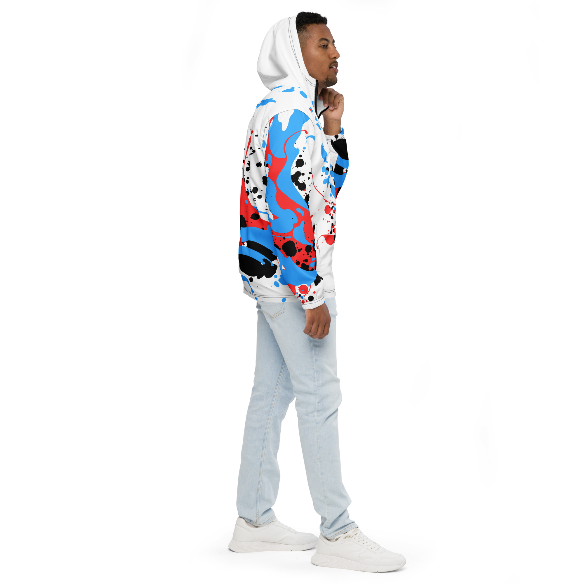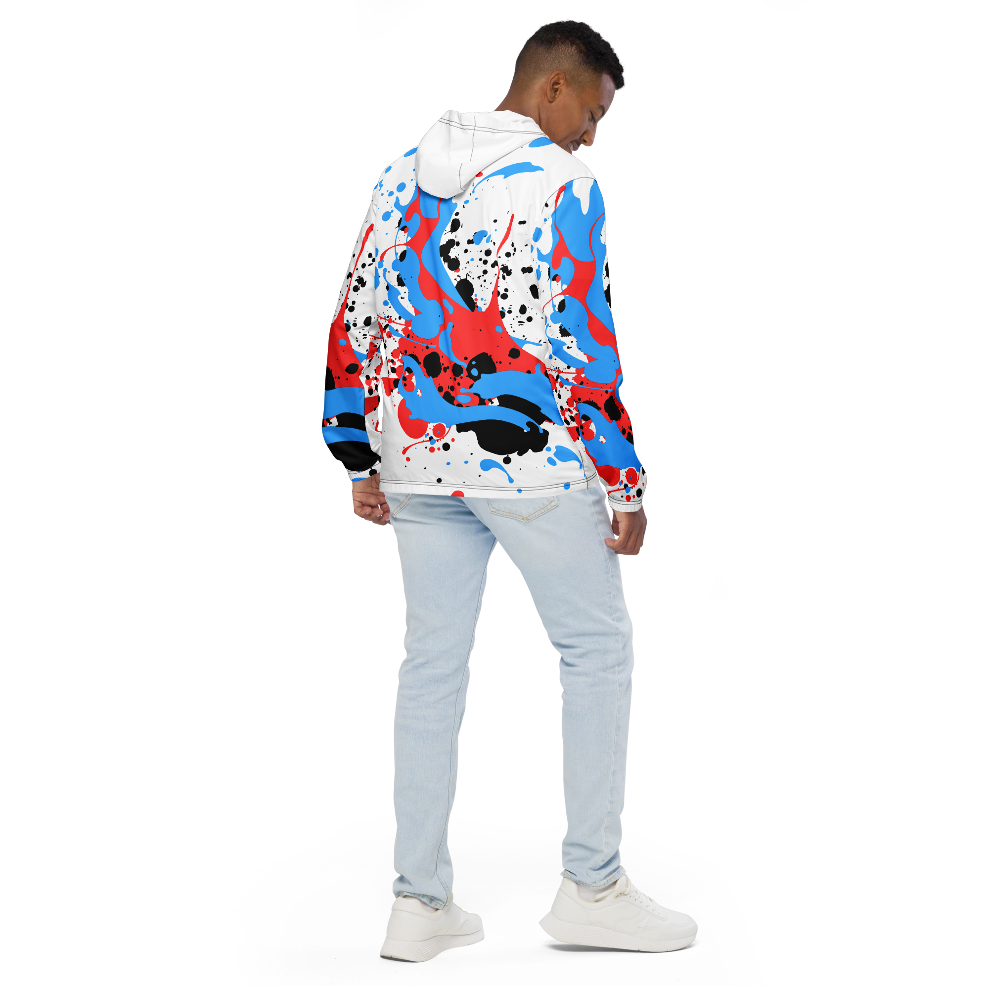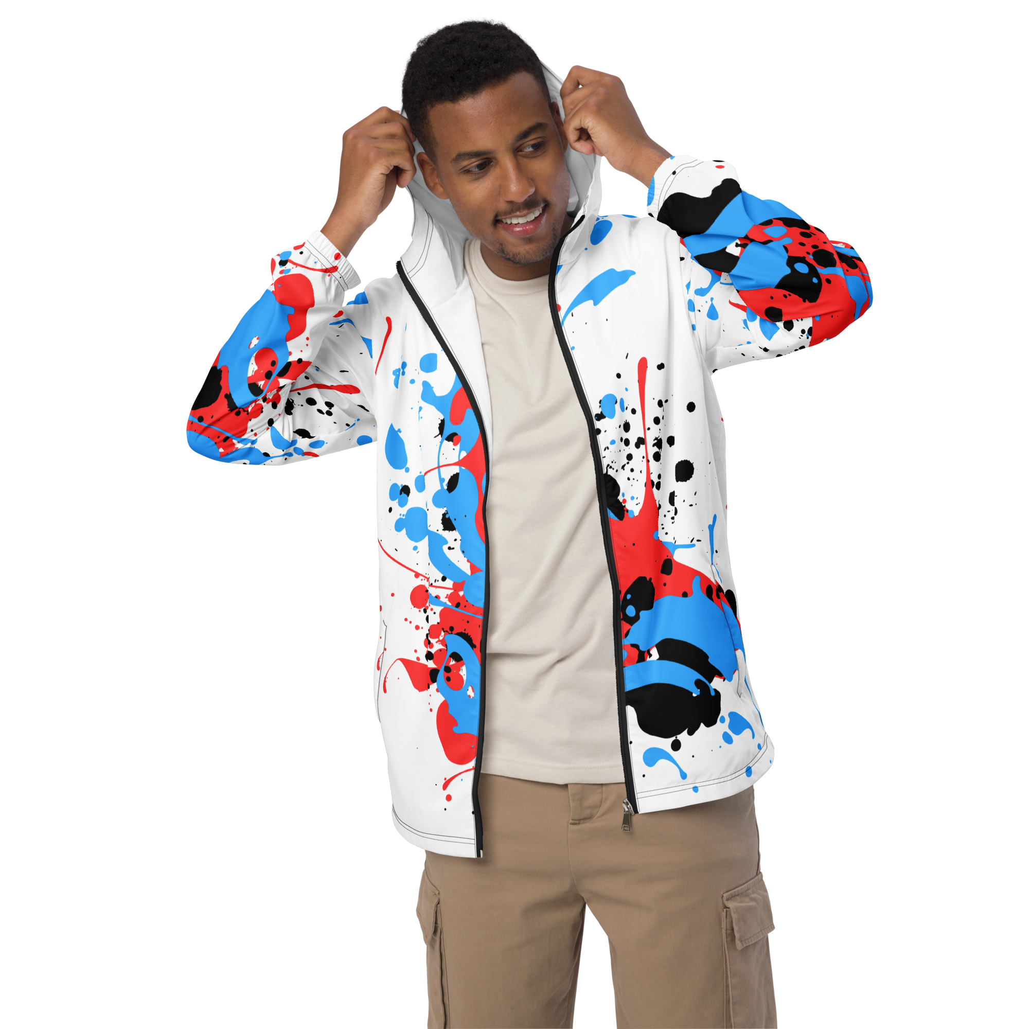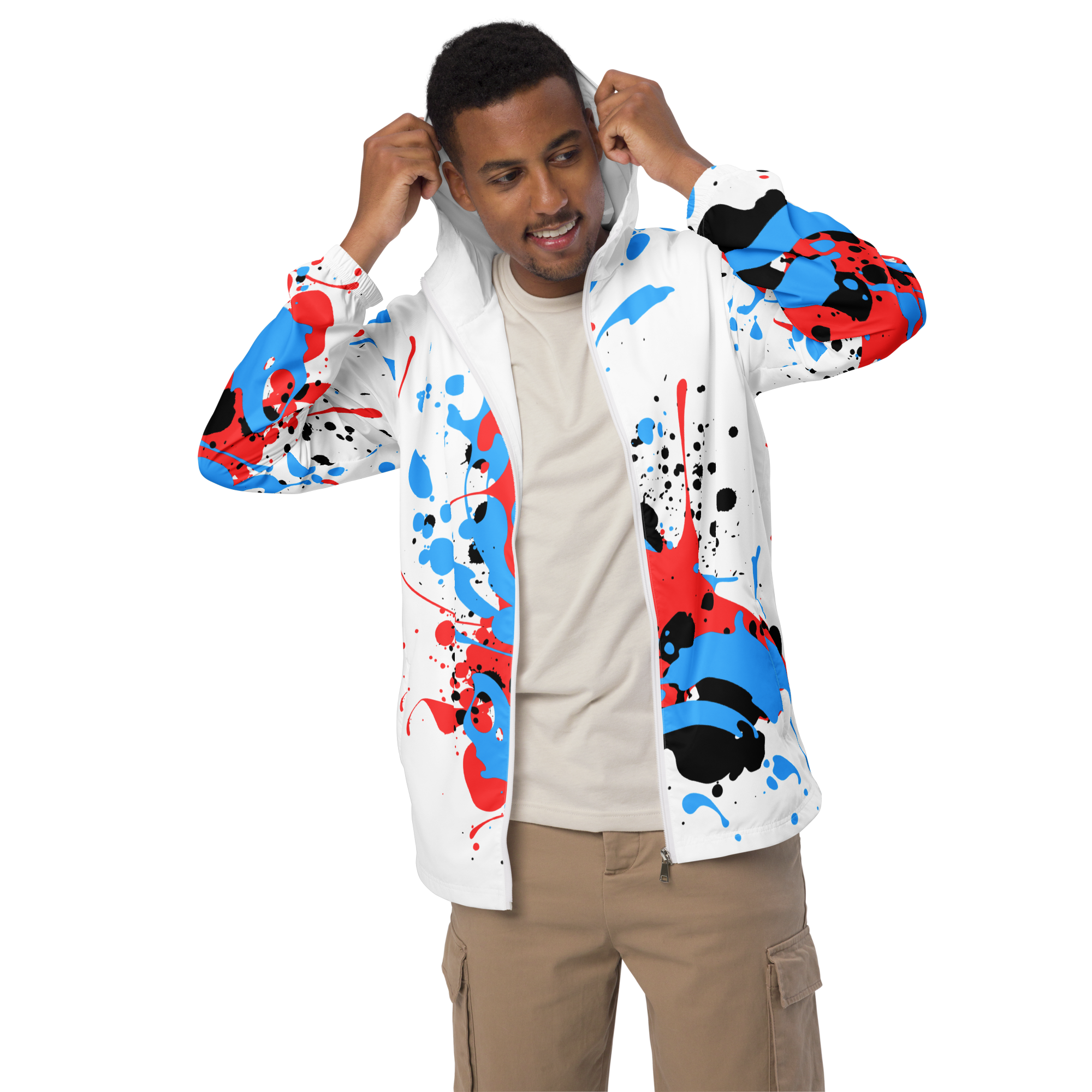 This stylish men’s windbreaker combines functionality with an artistic touch. The white base layer is adorned with dynamic splashes of red, blue, and black, creating an energetic and bold look. The jacket is lightweight and perfect for all-weather wear, making it ideal for everyday activities or sporty adventures.